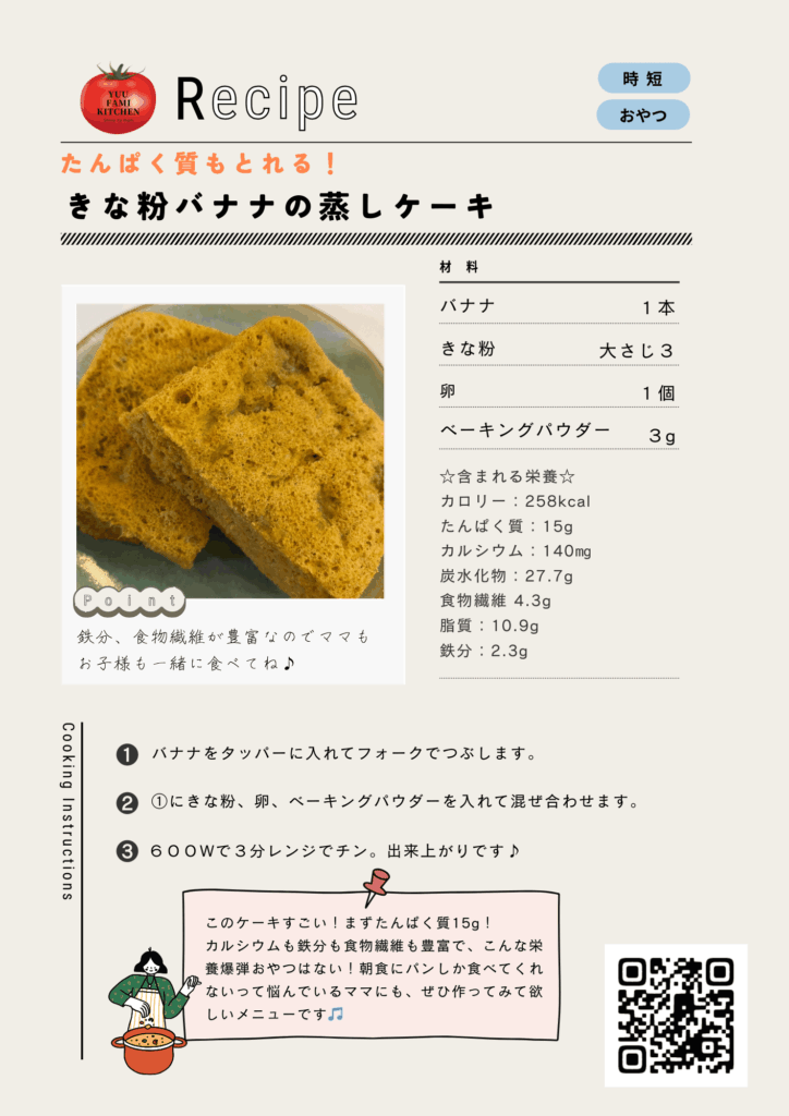 「この蒸しケーキは“ただ甘いだけ”じゃなくて、たんぱく質15g・鉄・カルシウム・食物繊維までとれる栄養おやつ。
